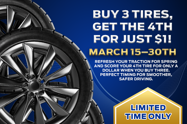 Plus tax and applicable fees. Valid with purchase of three qualifying tires. May not combine with any other offer. Must present coupon at the time of purchase. See dealer for details.